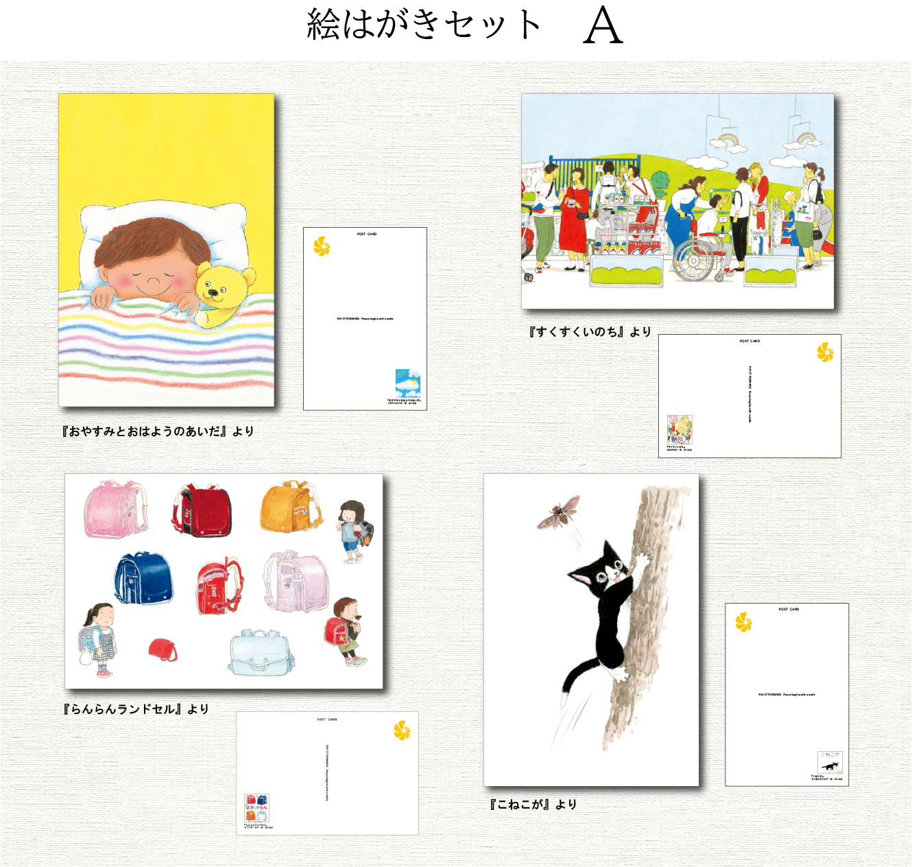 - 10セット分(2000円)で1冊の絵本と絵はがきセットを贈ります